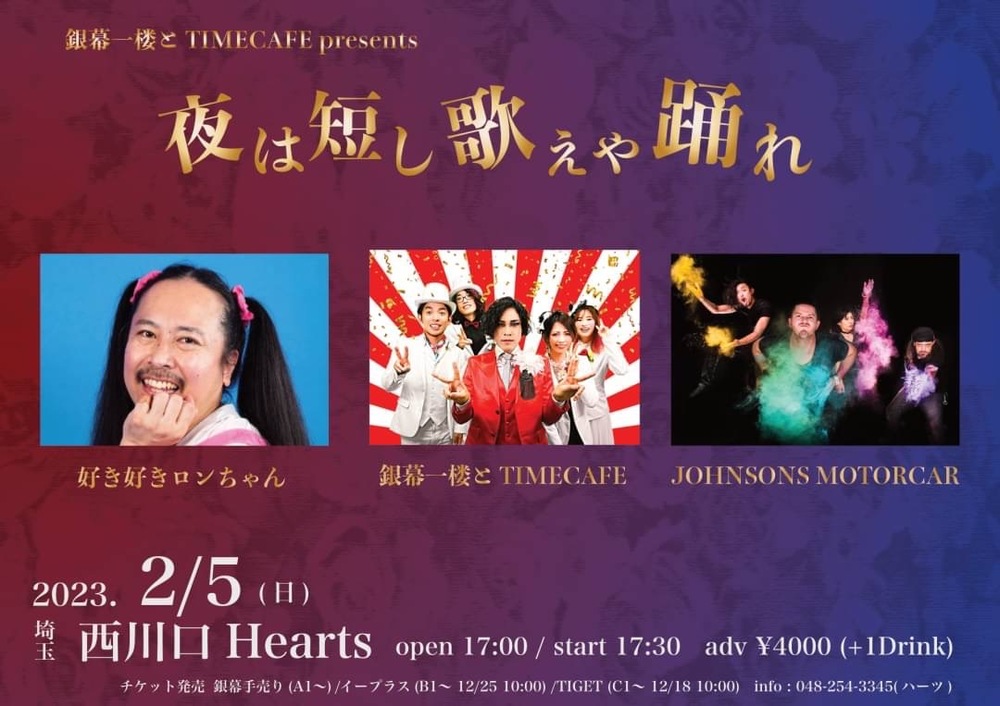 銀幕一楼とTIMECAFE Presents『夜は短し歌えや踊れ』 SCHEDULE 2023/02/05(日) 埼玉・西川口Hearts 銀幕一楼とTIMECAFE / 好き好きロンちゃん / JOHNSONS MOTORCAR open 17:00 / start 17:30 | adv 4000 / door 4500 URLをコピーする 報告する