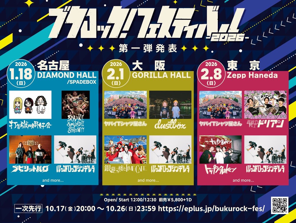 ブクロックフェスティバル2026 SCHEDULE 2026/02/01(日) 2026.02.01(日) 大阪 GORILLA HALLブクロックフェスティバル2026 🎫https://eplus.jp/bukurock-fes/ ※一次先行 10/26まで URLをコピーする 報告する