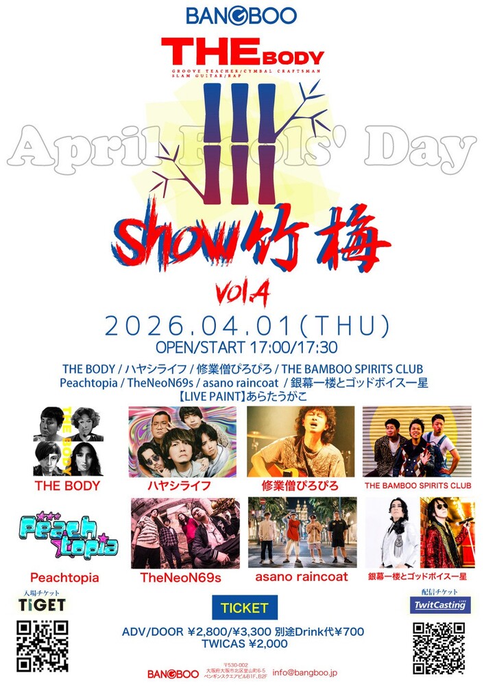 THE BODY / ハヤシライフ / 修業僧ぴろぴろ / THE BAMBOO SPIRITS CLUB / Peachtopia / TheNeoN69s / asano raincoat / 銀幕一楼とゴッドボイス一星 / 【LIVE PAINT】あらたうがこ